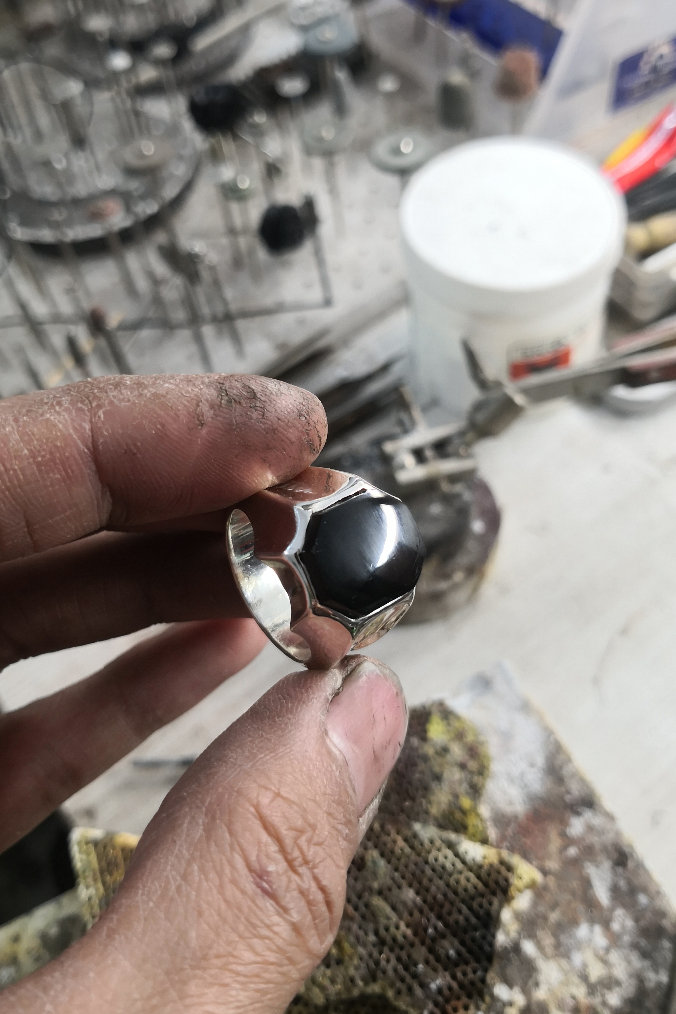 انگشتر نقره کاملا دست‌ساز نگین عقیق مشکی یمن اصل