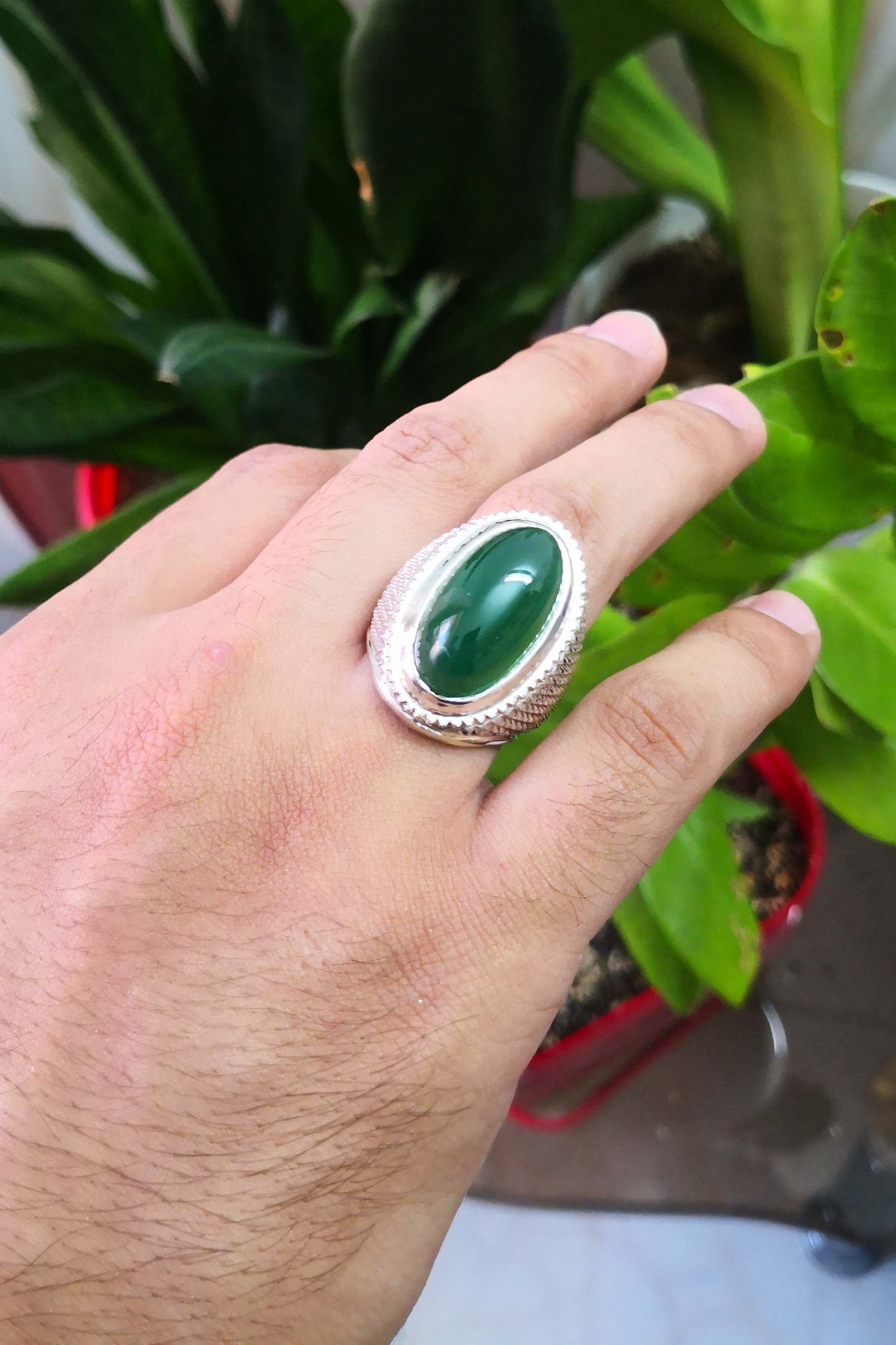 انگشترمردانه نقره کاملا دست‌ساز نگین عقیق سبز